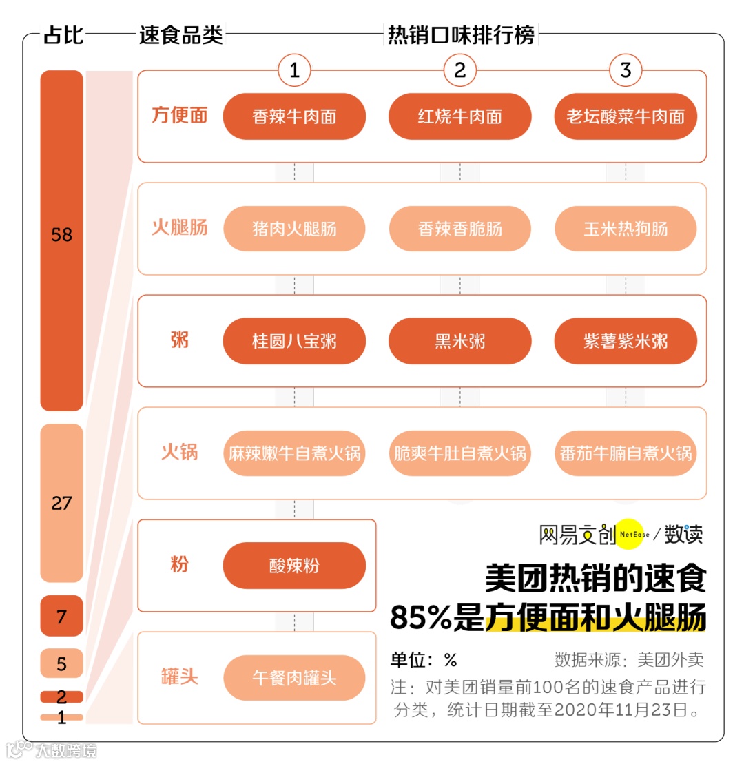 根据美团外卖数据,外卖热销的速食品中,58% 是方便面,27% 是“泡面搭档”火腿肠。和必须提前囤货的网红速食相比,随处可见的方便面显得更加亲民。