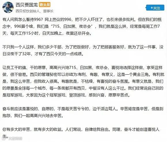 近日,西贝餐饮创始人、董事长贾国龙发表的一番话让大家对西贝有了一个重新的认识:“996算个啥,我们是715,白加黑、夜总会。”
