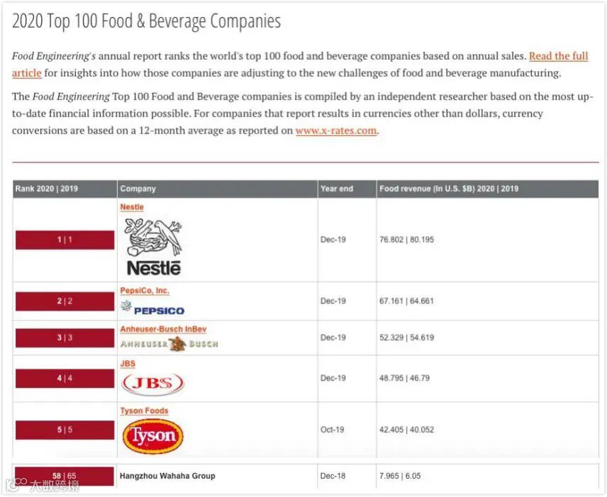 1、娃哈哈上榜2020全球食品饮料100强