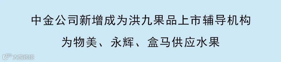 此外,成立于2002年的洪九果品同样于2019年12月同东兴证券签署上市辅导协议,后于今年7月转由中金公司担任辅导机构,其在商业模式上主打“端对端”,即上游直接对接国内外优质产区果园,下游对接终端零售渠道,其同样获得CMC资本、深创投、中信建投等知名机构的投资。