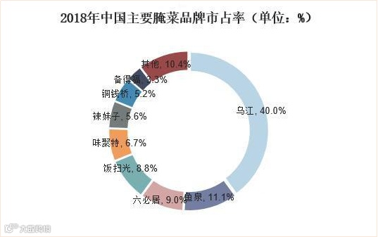 华经情报网数据显示,2018年,涪陵乌江榨菜品牌就稳坐腌菜行业第一的位置,市场占有率达到40%,渠道终端覆盖了全国市场。排名第二的鱼泉榨菜,占比不过11.1%,仅以成都和北京市场为主。