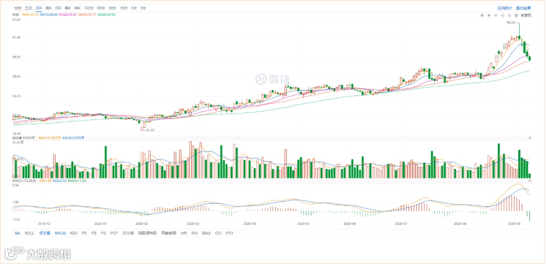 9月初,食品板持续拉升,有“榨菜第一股”之称的涪陵榨菜股价达到55.46元/股,上涨7.34%,市值接近440亿。