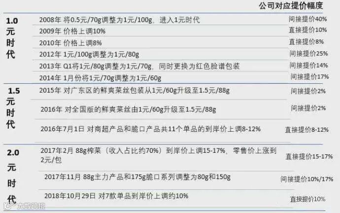 2008年,涪陵榨菜集团首次提价,原价0.5元/70g的袋装榨菜,变成了1元/100g,上调幅度达到40%。