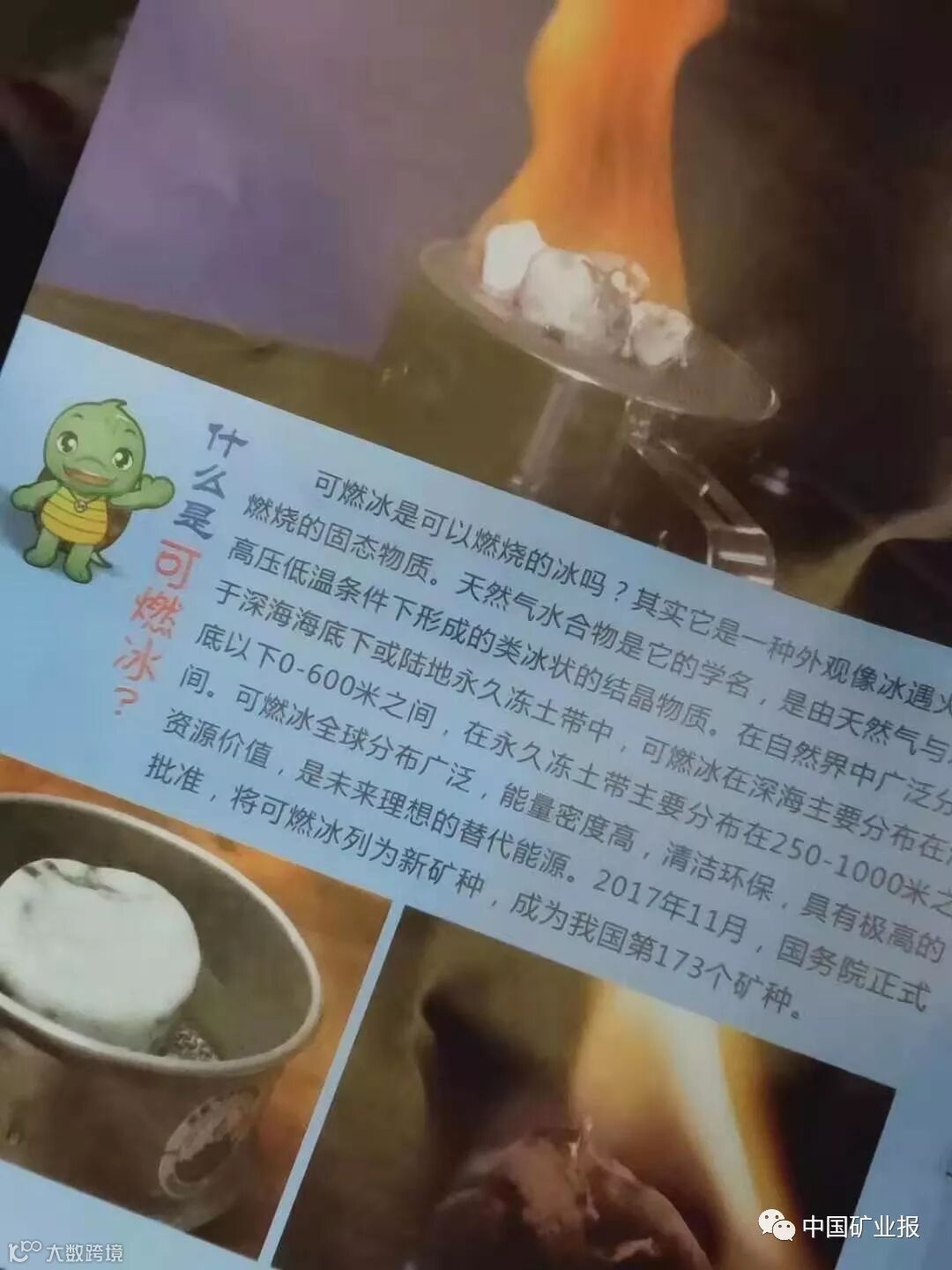 可燃冰,学名天然气水合物,是资源量丰富的高效清洁能源,被誉为“21世纪最具开发前景的绿色清洁战略能源”。自然资源部中国地质调查局广州海洋地质调查局自1999年起在国内率先开展了海域可燃冰勘查研究。经过近20年不懈努力,2017年由自然资源部中国地质调查局组织、广州海洋地质调查局承担实施的我国首次海域“可燃冰”试采取得圆满成功,创造了产气时长和产气总量两项世界纪录,实现了我国在可燃冰勘查试采领域由“跟跑”到“领跑”的历史性跨越。2017年11月,经国务院正式批准,天然气水合物被列为中国第173个新矿种。