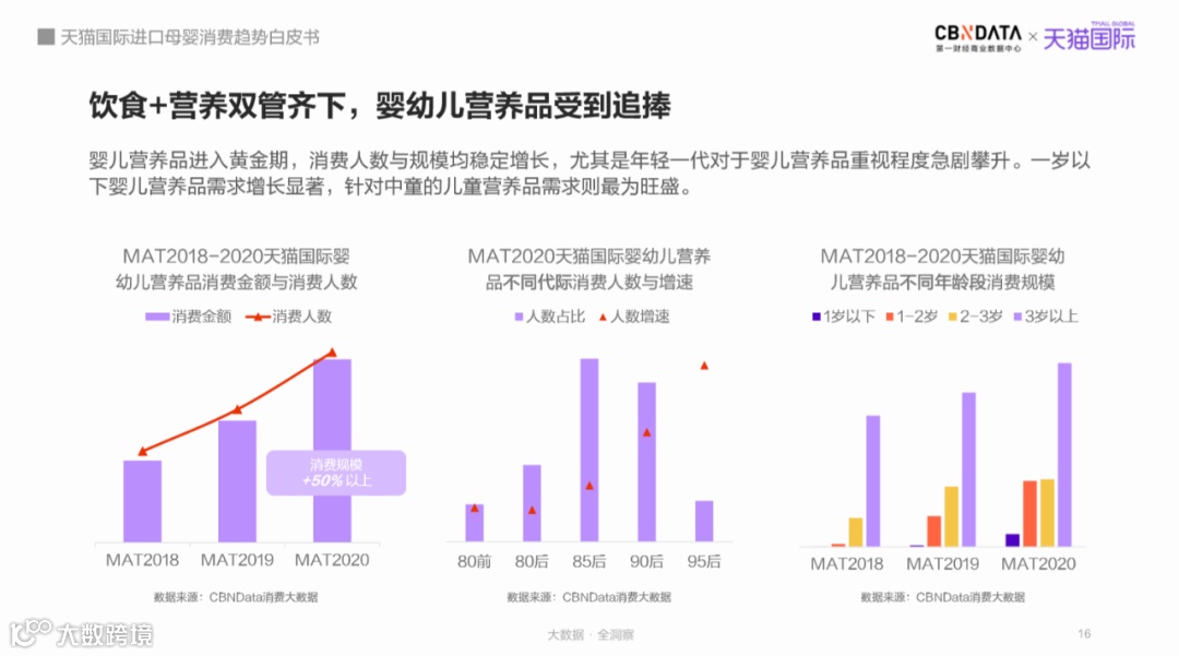 随着年轻群体步入社会,他们显示出更高的消费能力、更多元的消费特点。CBNData《报告》显示,90和95后在进口母婴品类消费中占据半壁江山,代际人数持续增加。