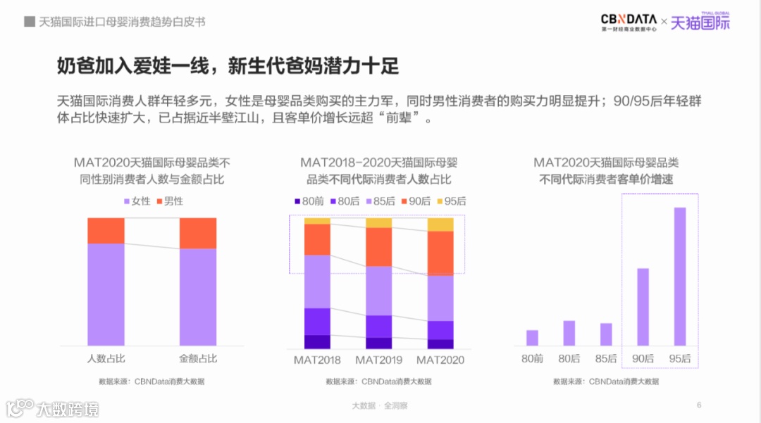 新生代奶爸奶妈们为娃消费毫不手软,在进口母婴消费中,客单价远高于90前人群。值得注意的是,在天猫国际母婴品类消费人群中,男性消费者的购买力和购买人数明显上升,奶爸们显示出不俗的消费潜力。