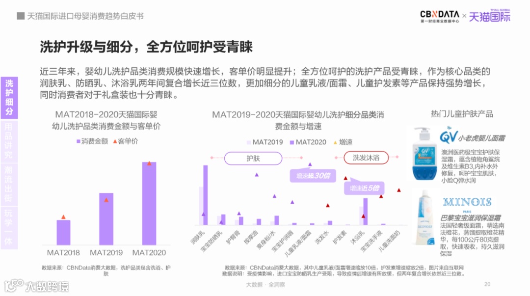 婴幼儿健康成长离不开饮食与营养的全面助力,更需要外用产品的细腻呵护。天猫国际进口婴幼儿洗护品类近三年保持高速规模增长,客单价明显提升。