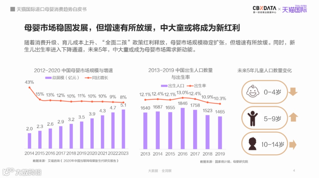 随着消费升级、育儿成本上升和“全面二孩”政策的释放,母婴市场规模呈现出稳定扩张的局面。根据CBNData《报告》显示,母婴市场预计2023年将达到5.05万亿。随着出生率下降,未来5年,中大童或成为母婴市场需求新动能。
