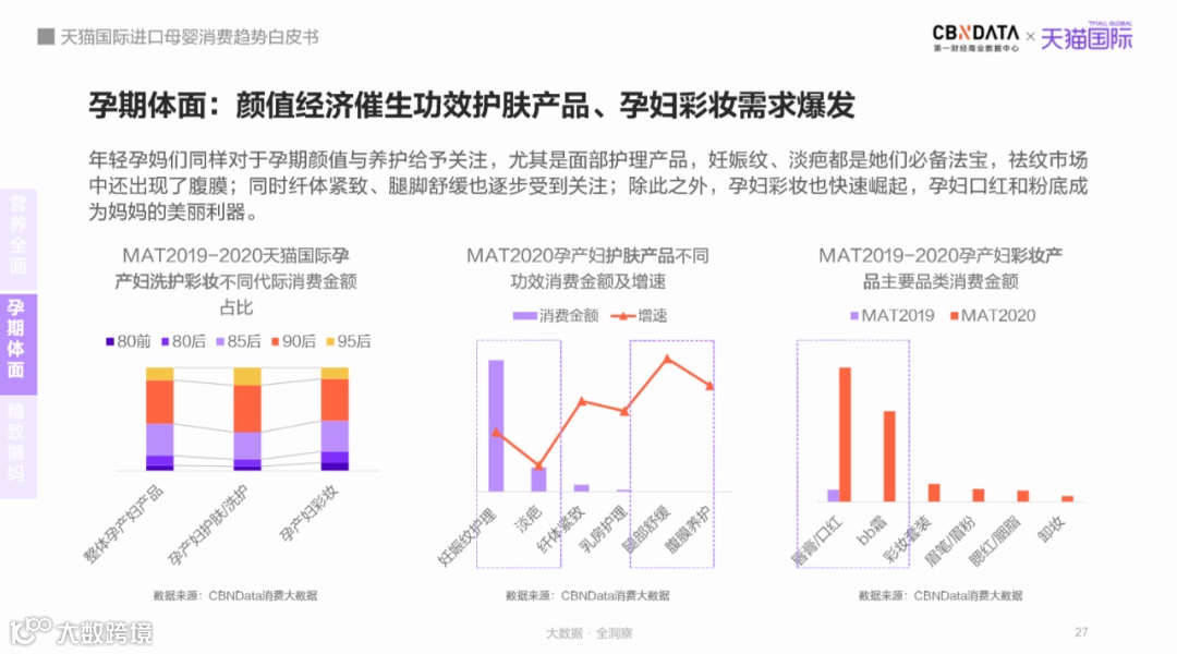 CBNData《报告》显示,近三年孕产妇相关用品消费金额和消费人数均持续高速增长,孕妇营养品消费规模领先于其他类别。年轻妈妈们追求精致,带来孕产妇护肤、彩妆产品与产后修复仪器消费的高速增长。