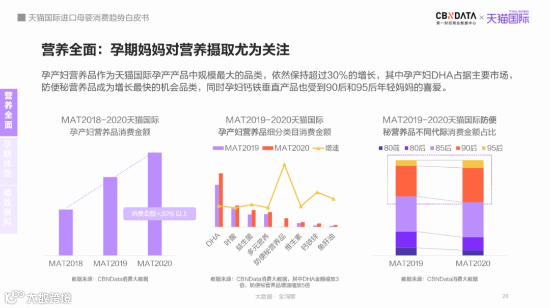 孕期的营养摄取成消费热点。2020年,天猫国际进口孕产妇营养品消费金额增长30%以上,在多种细分营养品类目中,DHA需求最广,占据主要消费规模;防便秘营养品受年轻孕妇妈妈喜爱,在营养品消费中增速最快。
