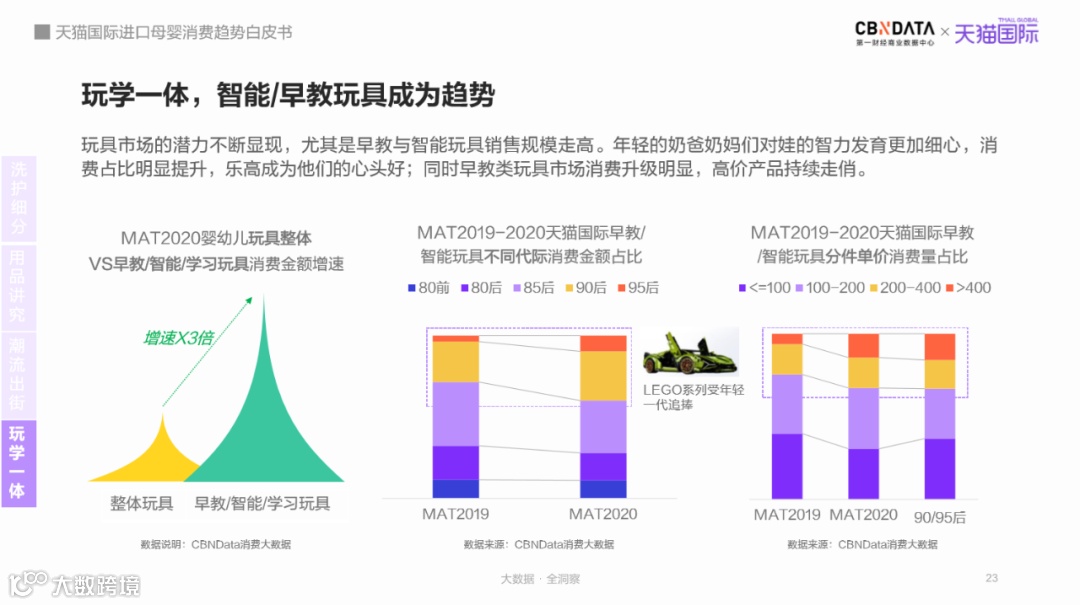 玩具是孩子们无法拒绝的存在,也是他们发展智力和创造力的重要方式。家长们对让孩子可以在“玩中学”的早教与智能玩具有更高的消费热情与购买积极性。CBNData《报告》显示,早教、智能、学习玩具的消费增速是整体玩具的三倍。