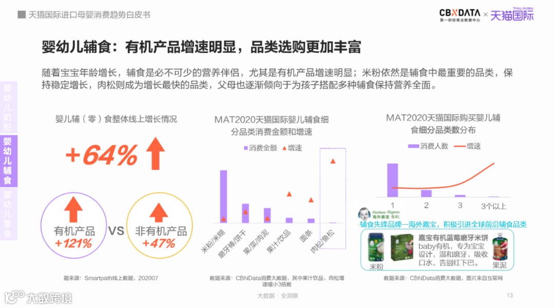 单一辅食为婴幼儿成长提供的营养较固定有限,营养全面的多种辅食搭配逐渐成为父母的选择。根据《白皮书》显示,2020年天猫国际购买3种及以上辅食细分品类的消费人数增速较快,有机产品的消费增速尤其明显。婴幼儿食品品牌也在应势积极拓展自己的产品线,以嘉宝为例,提供有机磨牙米饼、米粉、果泥等多个辅食品类。