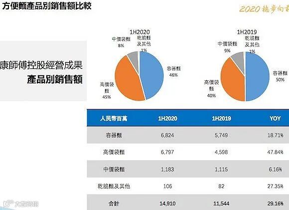 报告期内,康师傅的业绩增长主要依靠在总营收中占比近一半的方便面业务。后者2020年上半年收益为149.1亿,同比增长29.16%,占集团总收益45.27%。得益于促销力度下降、产品升级及产品优化,上半年方便面业务净利润同比增长93.54%至16.94亿,几乎翻了一倍。从康师傅业绩演示材料看,高价袋面、容器面、干脆面均获得了双位数增长,其中高价袋面比同期销售额增长达47.8%。