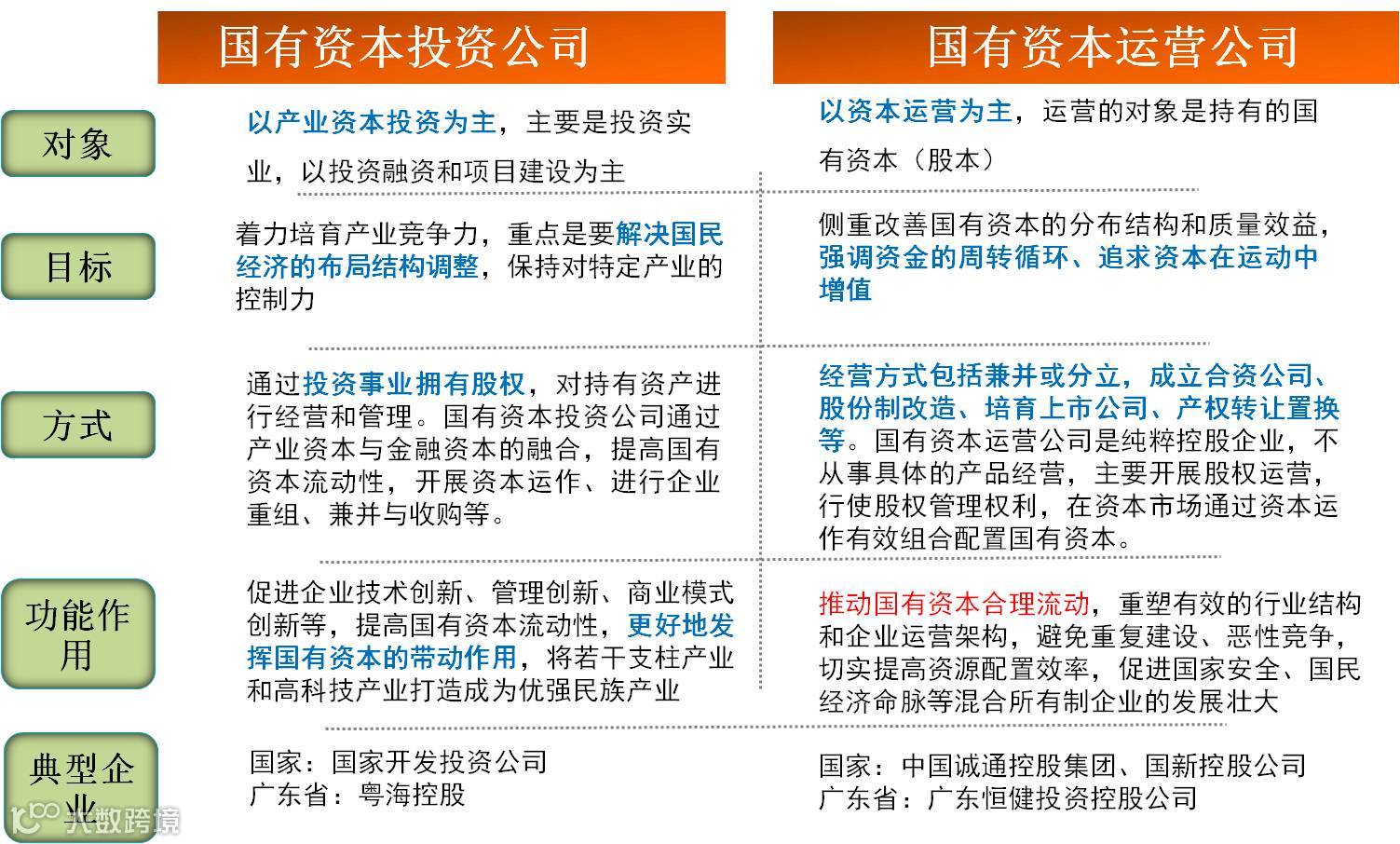 形象地说,二者都是政府管理国有经济的两只手,只不过国有资本运营公司是侧重于市场配置的无形之手,代表政府治理和管理国有资本存量;而国有资本投资公司是侧重于政府调控的有形之手,代表政府管理国有资本增量,如战略性产业布局或者新建高铁等。