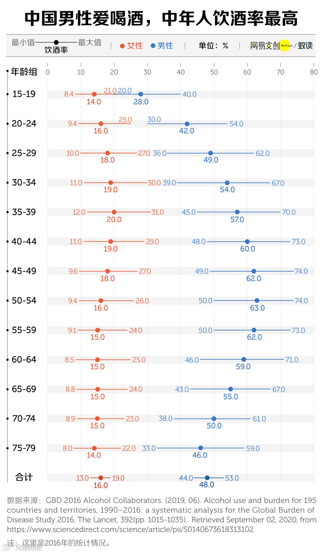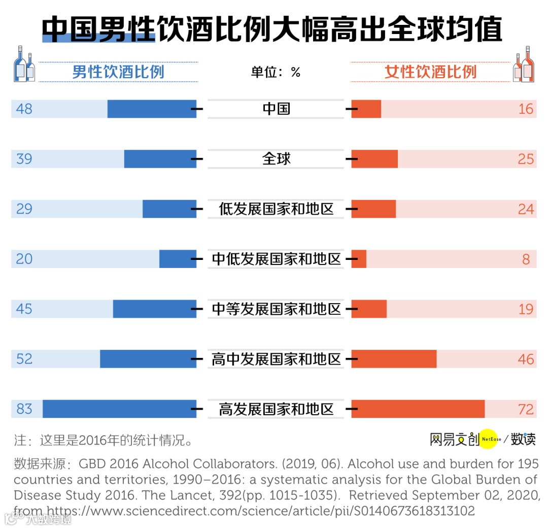 2018 年,医学杂志《柳叶刀》公布了全球疾病负担研究中的酒精负担调查数据:在 2016 年,中国男性的饮酒率为 48%,女性为 16%,两者间的比值达到了 3:1,而全球 195 个国家和地区的男女平均饮酒率就没有那么悬殊,两者分别为 39% 和 25%。[1]
