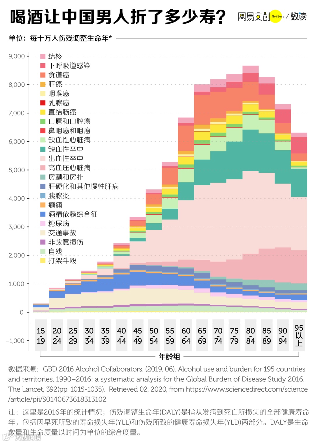 而 67 万仅是喝酒作为全死因而导致的死亡人数,按照世界卫生组织的统计,在 2016 年,中国死亡的男性中有 6.1% 是酒精造成的,因为喝酒喝出来的毛病实在是太多了。[7]