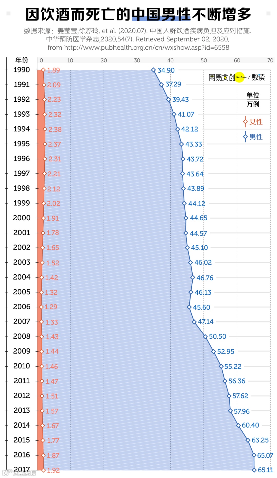 根据全球疾病负担研究(2017)的统计,2017 年中国饮酒致死人数达到了 67.03 万人,是 1990 年的 1.82 倍,其中有 97% 是男性。[6]
