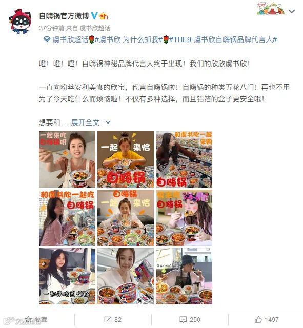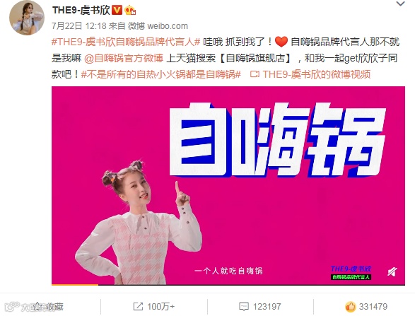 7月22日,自嗨锅正式官宣了虞书欣为代言人,其粉丝@卤_卤酱酱酱酱更是幸运地成为了自嗨锅官博的1小时使用者。