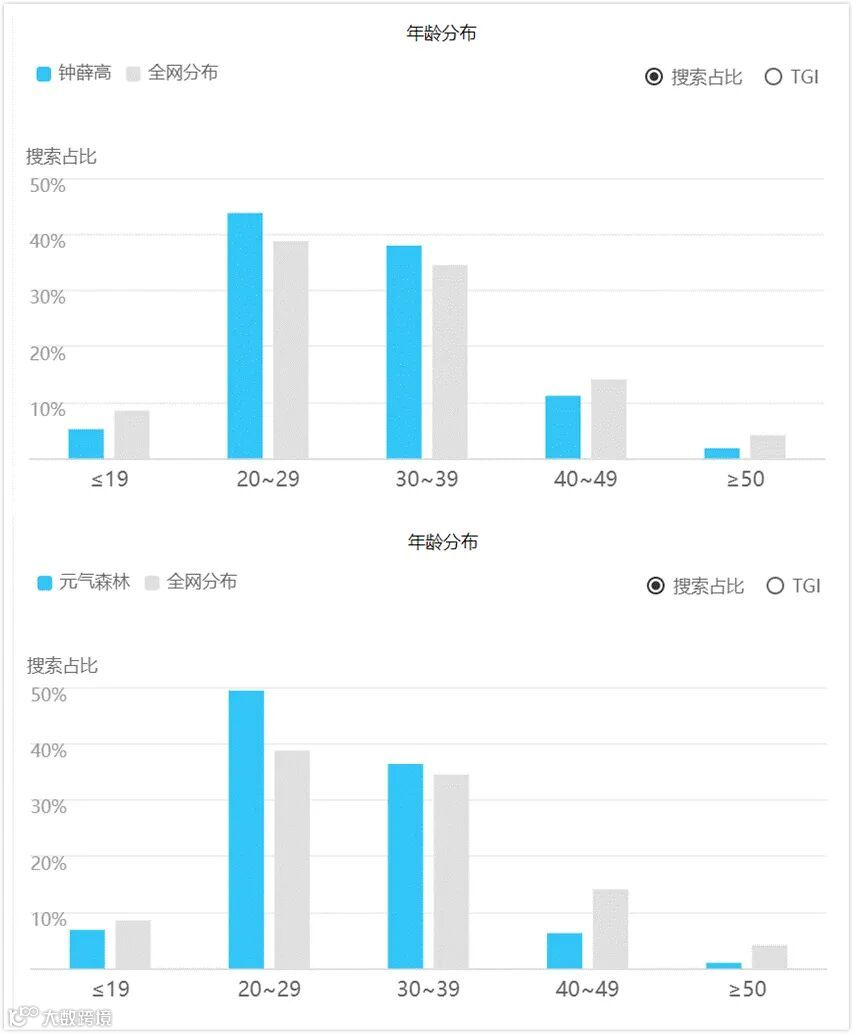 从百度指数来看,钟薛高的20-29岁人群,占比接近45%,元気森林的20-29岁人群占比接近一半。在这个年龄段,二者的搜索人群明显高于全网平均分布。