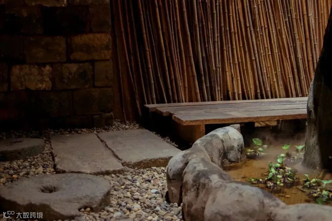 店内的设计风格更是不必说了,一小段青石板路后场景豁然开朗,和《桃花源记》一毛一样!