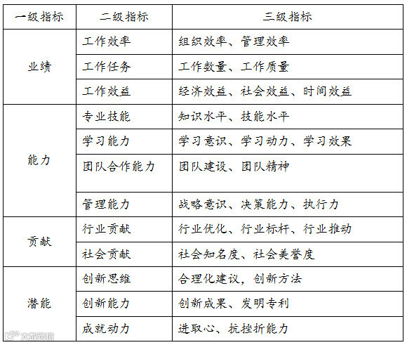 因此,企业可根据目的性原则、可操作性原则和科学性原则,构建集“业绩、能力、贡献、潜能”四位一体的人才评价指标体系。