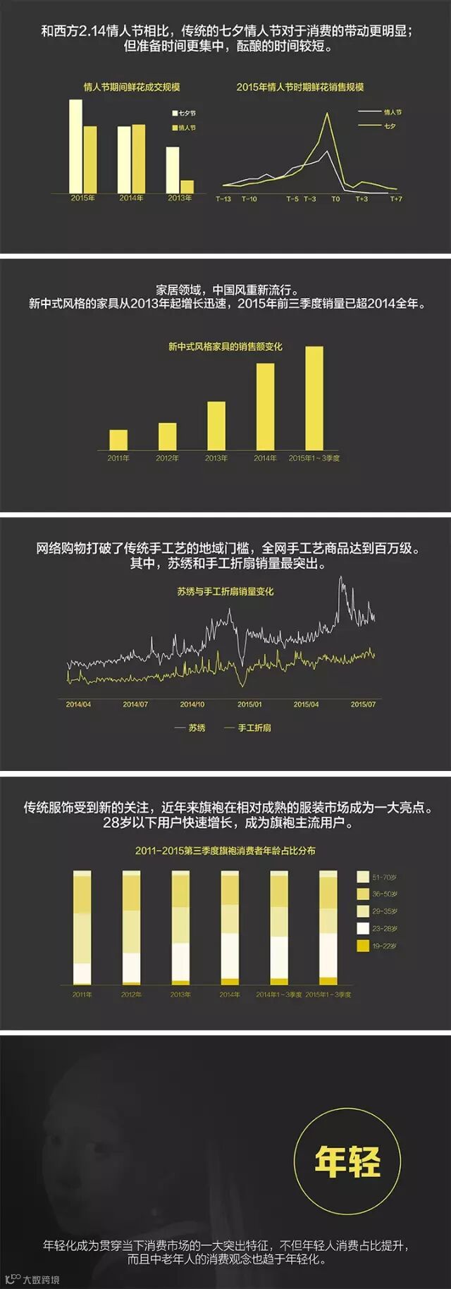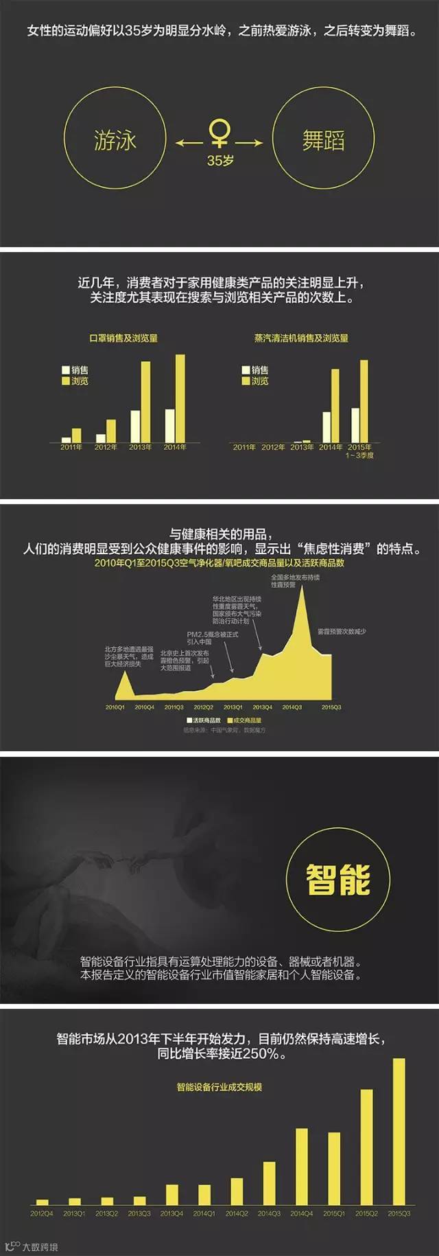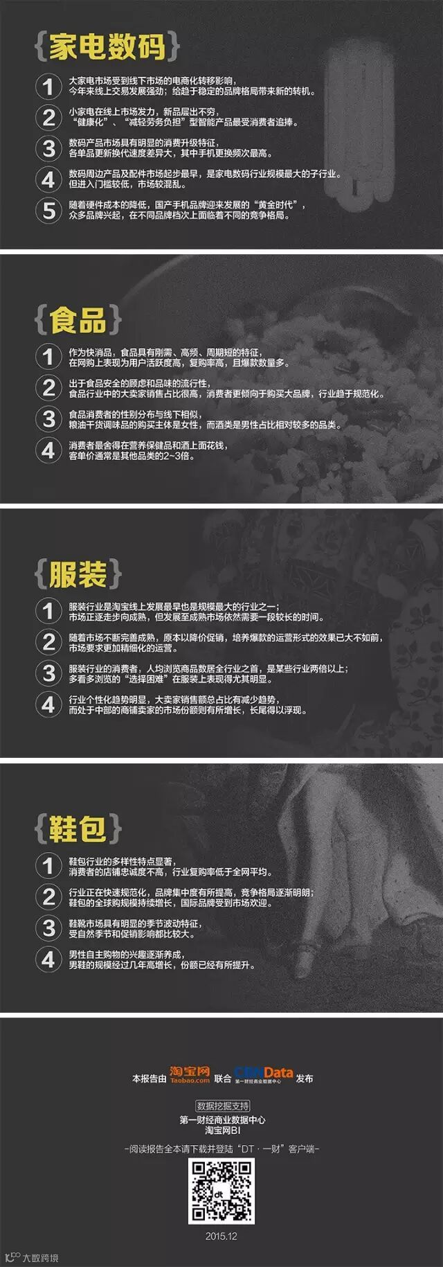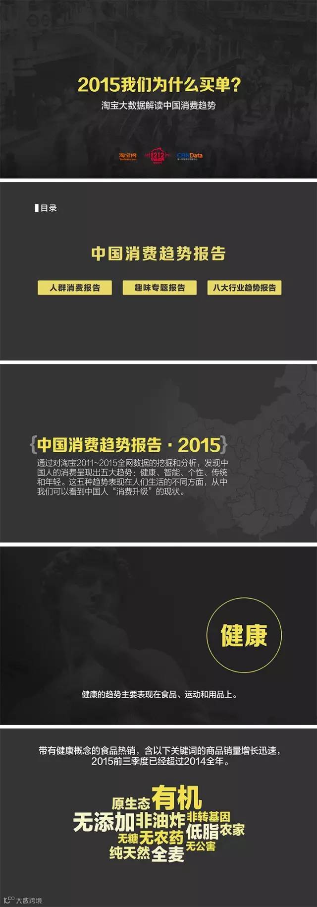 淘宝联合第一财经商业数据中心,发布了《中国消费趋势报告·2015》。发布的数据报告规模之大,前所未有。共有55份数据报告,包含中国消费趋势、不同人群消费数据、行业数据报告和趣味专题数据。55份数据报告总结提炼成80页PPT,干货新鲜出炉。