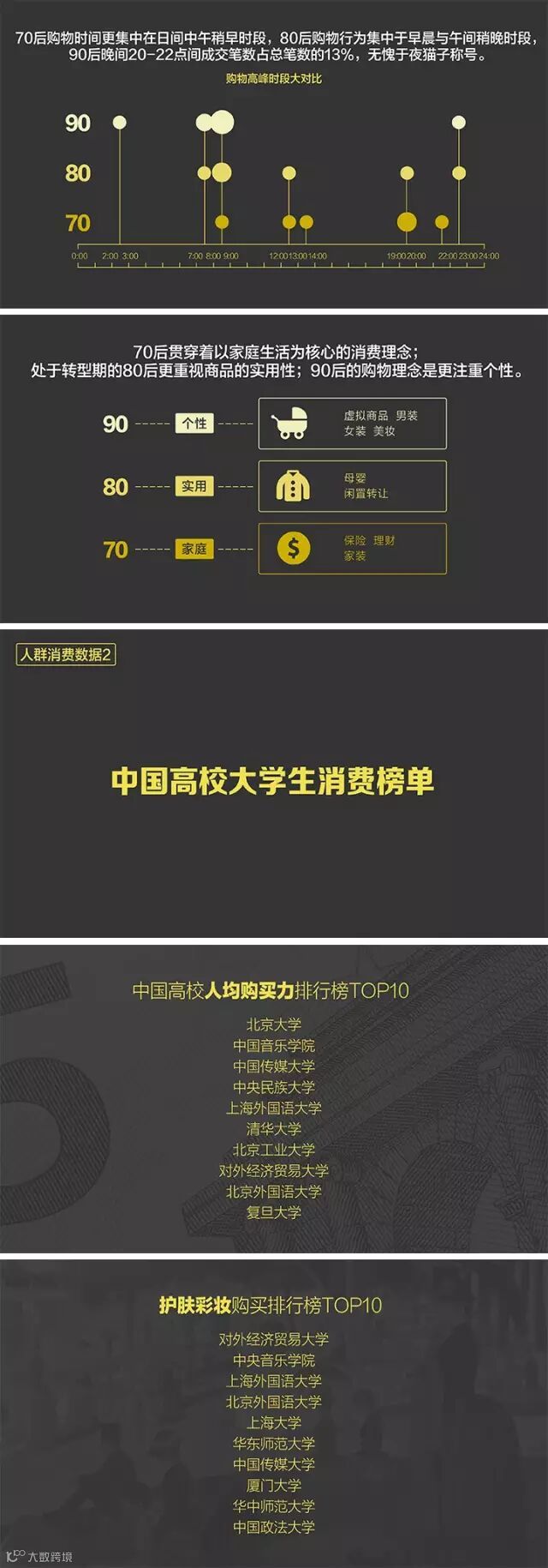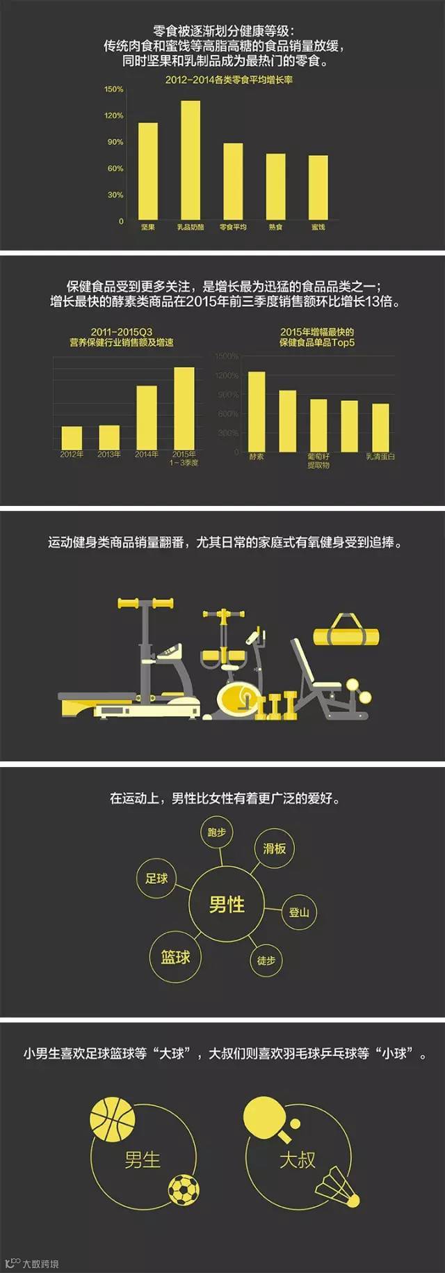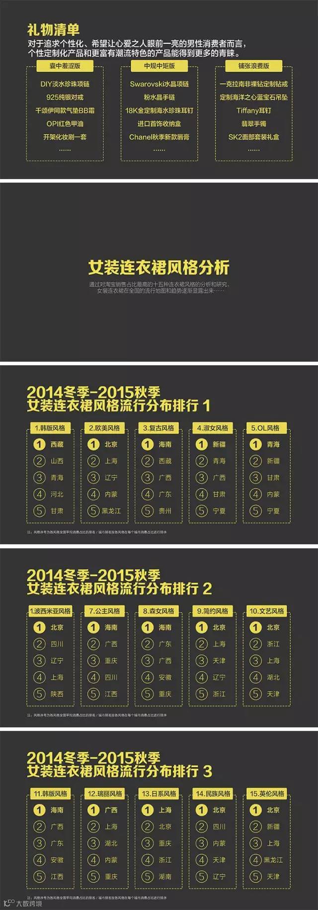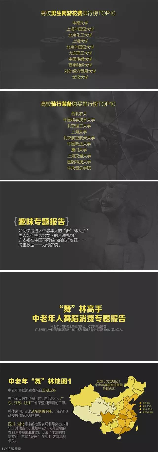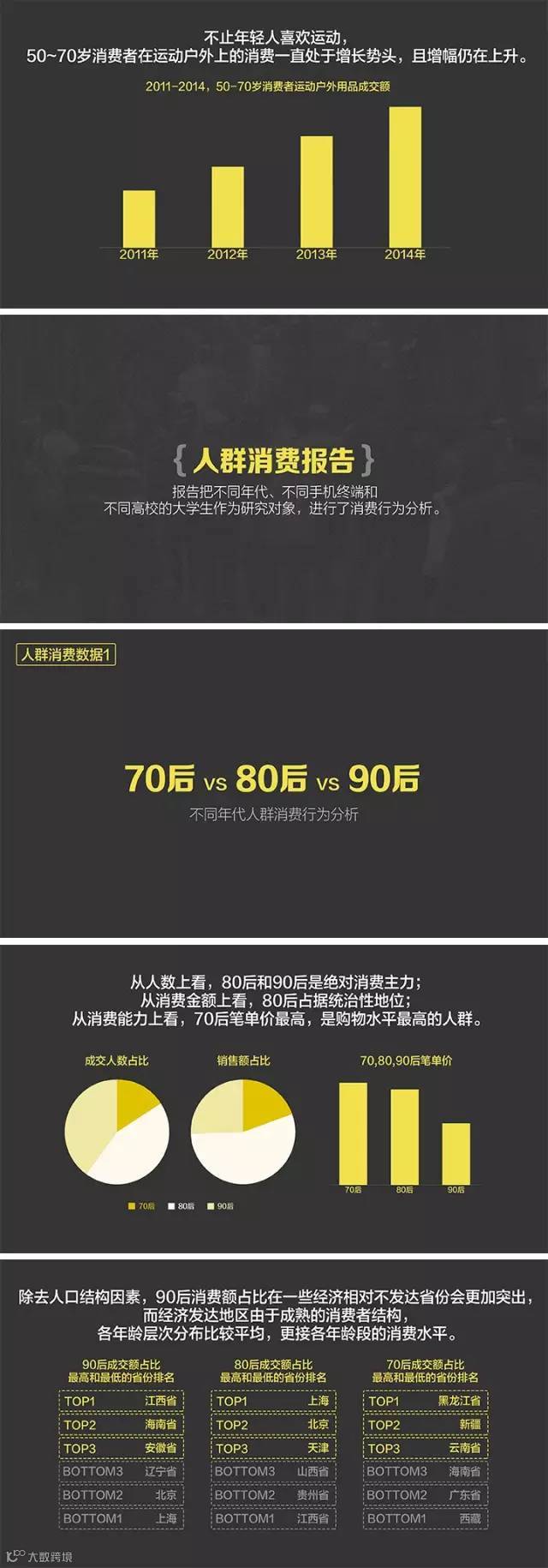 淘宝联合第一财经商业数据中心,发布了《中国消费趋势报告·2015》。发布的数据报告规模之大,前所未有。共有55份数据报告,包含中国消费趋势、不同人群消费数据、行业数据报告和趣味专题数据。55份数据报告总结提炼成80页PPT,干货新鲜出炉。