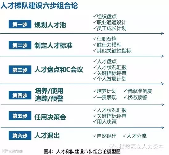 要实现基于人才库的人才梯队建设目标,其实施的最佳路线图是图4中所示的六步组合论。