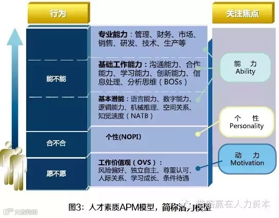 以冰山模型为原型,我们提出了人才素质APM模型,也叫人才潜力模型(见图3)。我们对冰山模型作了进一步的分析和解析,把冰山分为上中下三层,分别是能力(Ability)、个性(Personality)、动力(Motivation)。即“能不能”、“合不合”、“愿不愿”。在“能不能”中,水平之上的知识、经验、技能不属于潜力。其它自“基础工作能力”及其以下都属于潜力的范畴。