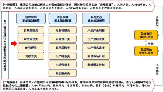 战略导向的人员编制预算思想的前提条件是:集团公司总部的战略管理与战略预算机制能够支撑将集团战略目标和战略预算从集团总部向各产业板块(拟或是二级集团或SBU)进行预算(一级预算,即,总分预算),同时,从各产业板块(或二级集团或SBU)向子公司(三级公司或二级SBU)进行预算(二级预算,二级总分预算),一级预算与二级预算相结合,构成战略导向的集团公司人员编制双向预算模式。