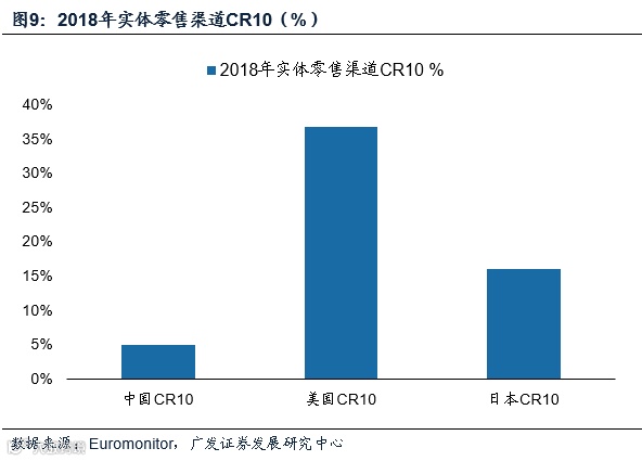 市场结构的成熟度与经济发展阶段有关,目前中国的经济发展阶段来说,大部分行业的行业集中度提升仍有空间。以实体零售渠道为例,中国CR10已由2013年的4.2%上升至2018年的5.0%;而2018年美国实体零售渠道CR10为36.8%。
