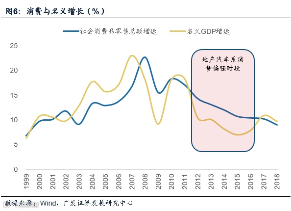 从中国近两年数据看,2017-2019年消费均略低于名义GDP增速,但差距不大。2018-2019年消费大项中汽车增速偏低。如果汽车大致恢复常态,我们估计消费可能会在名义GDP增速附近。
