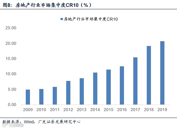 行业集中度的上升是经济发展中的一个必然过程,它对应着企业规模效应的出现和头部企业品牌溢价的形成。比如随着中国城市化的推进,房地产行业的市场集中度在过去10年中不断提升,CR10从2009年的4.9%升至今年的20%以上;CR30从8%升至32%。