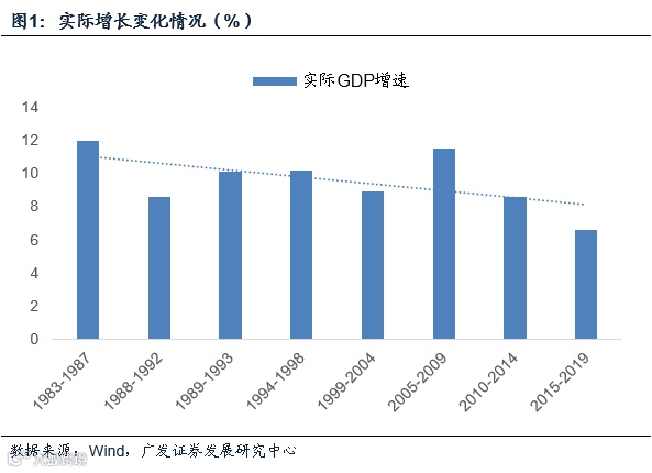 从OECD国家的经验来看,20世纪80年代之后的四十年,经济增速在呈现周期性的同时,整体是震荡下行的,中间有几个阶段下台阶,这反映从工业化到后工业化时代经济增长速度的逐步收敛。中国经济增长路径应有一定的相似性。