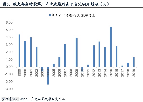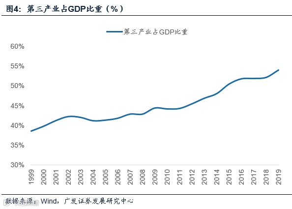 从过去20年的经验看,除少部分时段(2003-2004、2008、2010年)之外,绝大部分时段第三产业发展均高于名义GDP增速。2017-2018年领先幅度收敛;2019年前三季度则差值再度有所走高。从占GDP的比重来看,2015年第三产业占GDP比重达到50%,一般认为这是中国进入“后工业化时代”的标志数据之一。2016-2018年这一比重进一步上升至52%左右,2019年前三季度为54%。