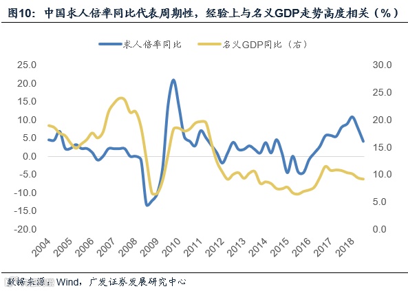 我们可以以求人倍率(有效需求人数/有效求职人数)作为一个观察指标。求人倍率的同比代表周期性,经验上与名义GDP走势高度相关。即在经济同比下降的周期中,需求下降比供给下降更快,就业压力会周期性加大;而求人倍率的绝对值,则代表就业绝对供求的趋势性。它就更为复杂,一方面每一阶段进入劳动力市场的人群是由前期出生、受教育、然后进入就业市场的人口曲线决定的;另一方面,供给又是分结构且彼此之间不可替代的,经济发展会扩大对某一类劳动力的需求。