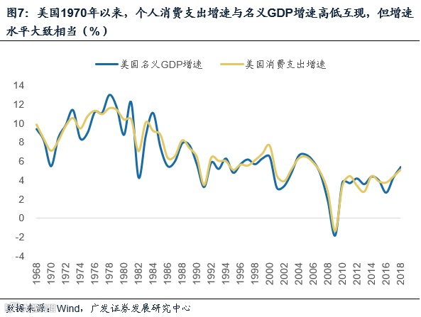 从美国1970年以来的数据看,个人消费支出增速与名义GDP增速高低互现,但增速水平大致相当,过去50年前者年均增速较后者略高0.3个点。