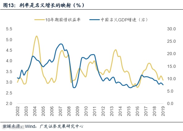 (一)利率是名义增长的映射。利率是我们借钱给别人的回报,这个回报包括两部分,一是预期的实际投资回报率,二是通货膨胀补偿。二者加起来在微观上对应利率,在宏观上对应名义GDP。所以利率的合理中枢多少,本质上是由名义GDP增速决定的。