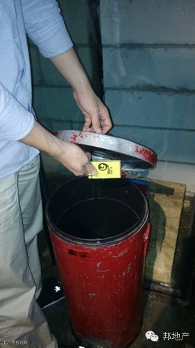 他打开大门旁边的红色旧垃圾桶,揭开桶盖,把一张黄色的门卡放到盖子背面一扫,“嘟”的一声,大门自动打开了。