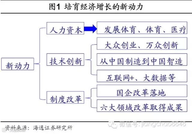 “十三五”期间,经济仍处转型阶段,仍需新、旧动力同时发挥作用。旧动力将分化,制造业中传统行业去产能,高端装备走出去,两众两创培育新增点,服务业中传统消费式微,新兴消费崛起,出口重心转向高附加值和服务贸易。新动力将壮大。提升人力资本意味着教育、医疗、体育等行业将迎来重大发展,技术创新将依托“中国制造业2025”和“互联网+”而实现,而各领域改革也将逐一落地兑现。