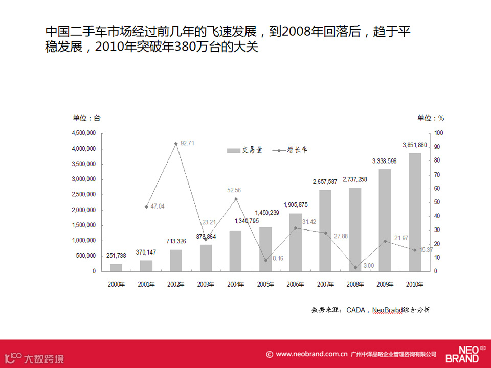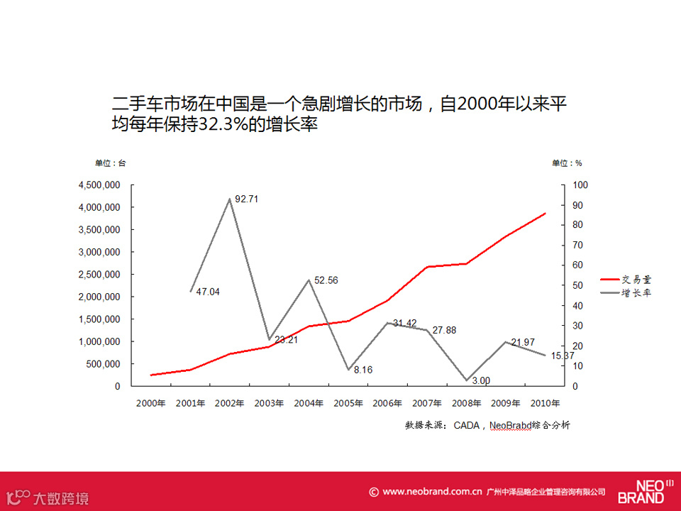 中国二手车市场是个典型的“柠檬市场”,每年的市场增长率达到32.3%,存在巨大机会。
