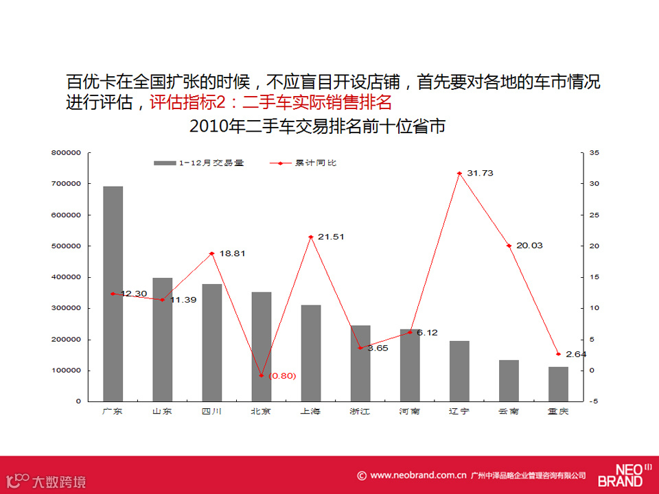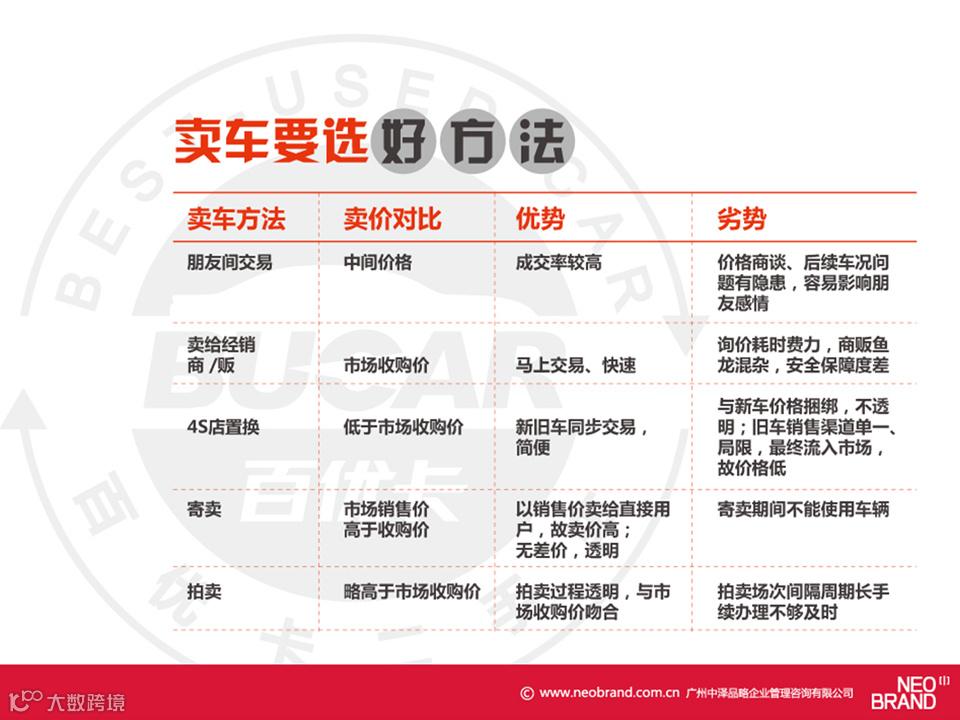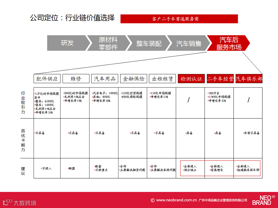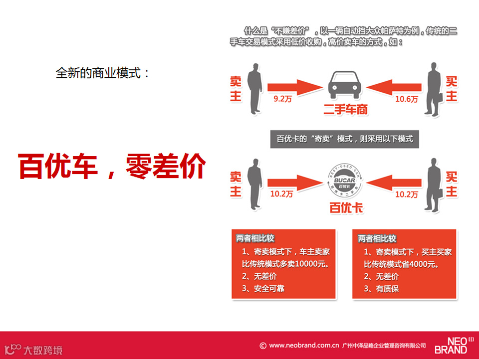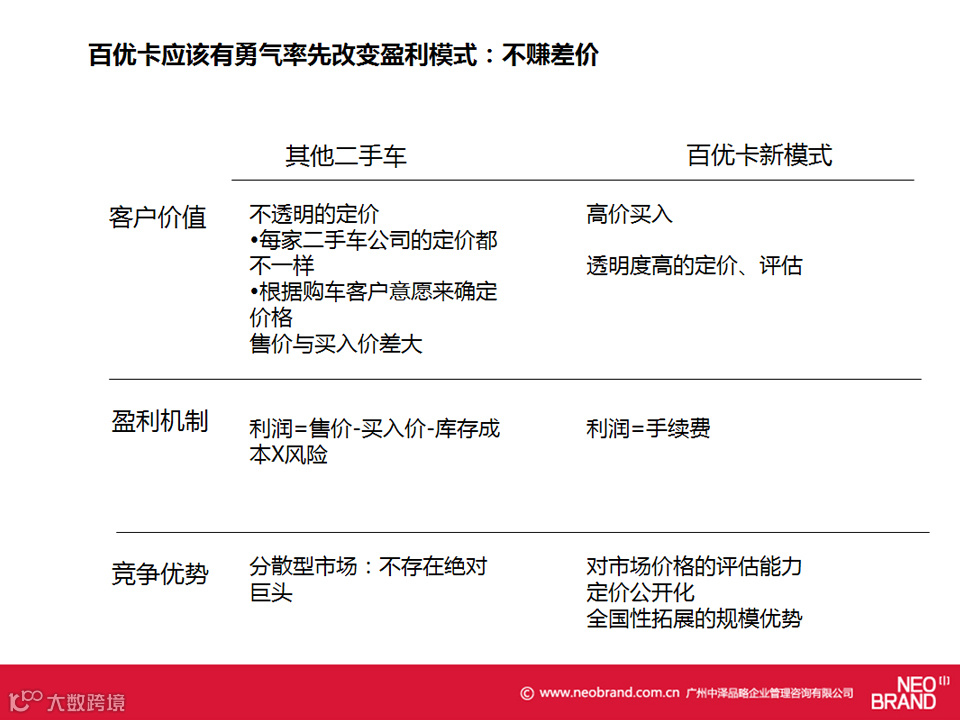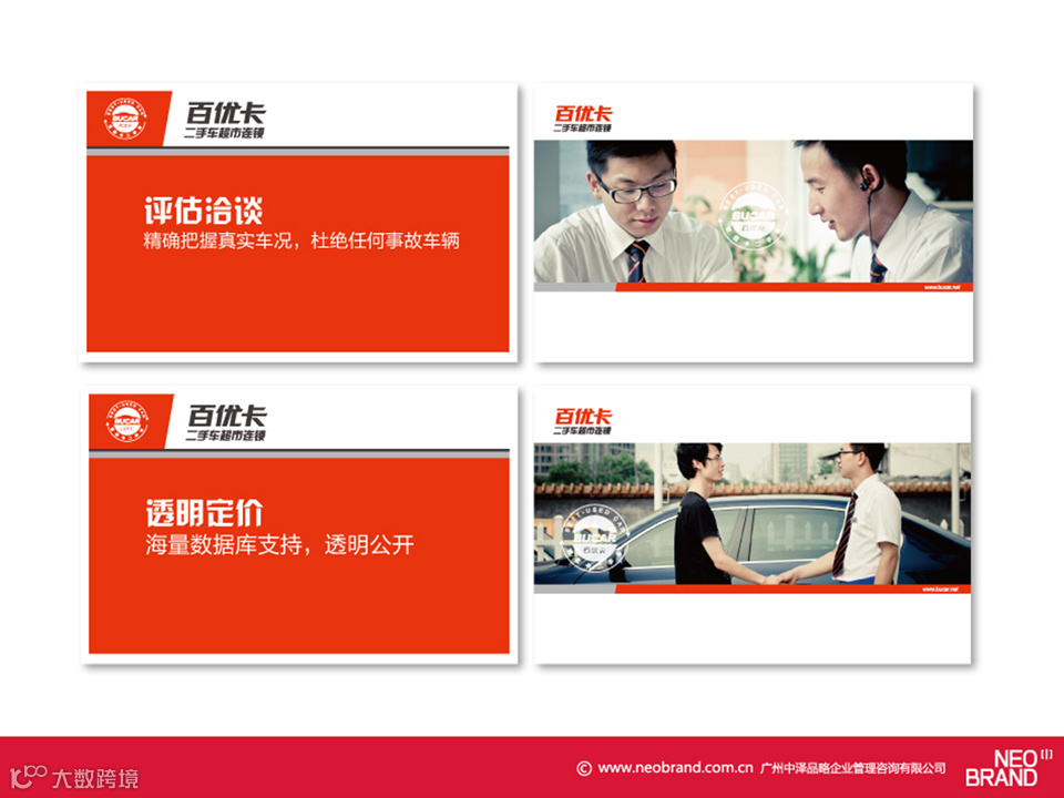 浙江百优卡二手车经营有限公司创建于2007年12月,是中国领先的二手车服务商,并且在中国首创了二手车4S店模式。随着二手车市场的逐渐成熟,同样面临激烈的同质化竞争,存在品牌形象模糊,战略定位缺失,商业模式陈旧等问题,百优卡的高层清晰的意识到了这些问题,不因循守旧,积极创新,并且与中泽品略携手,通过商业模式再造,品牌重新定位等手段,奠定了在二手车行业内的地位。