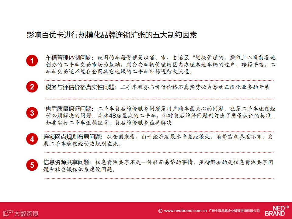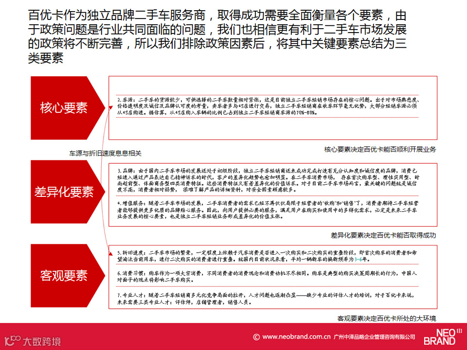 中国二手车经营成功的因素有很多,包括政策和非政策类,我们帮助百优卡清晰了解的各因素的关键及风险的把控因素。