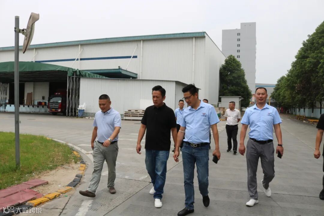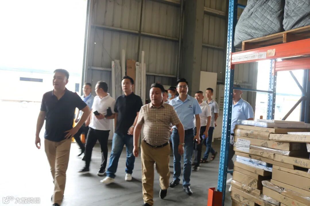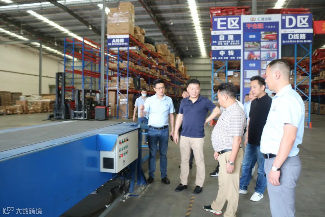 汇通运输董事长王城向陈志杰一行人介绍汇通龙泉仓自动传送带