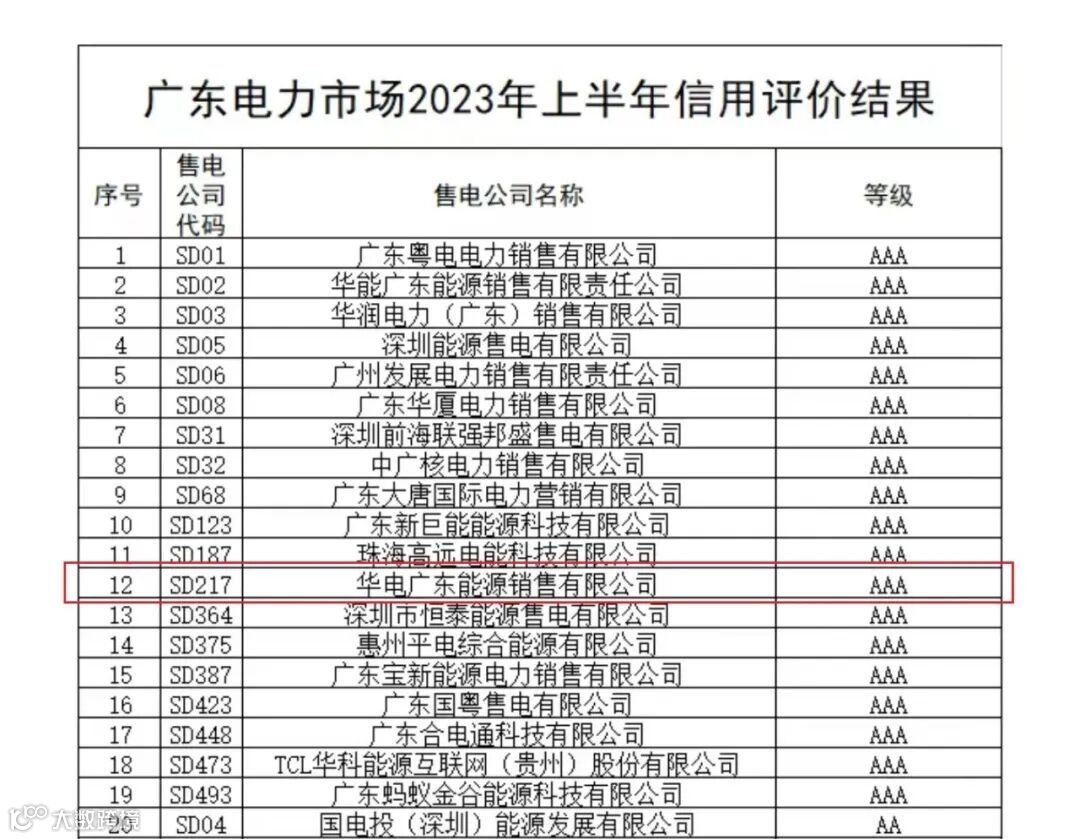 7月17日,广东电力交易中心公布广东电力市场2023年上半年信用评价结果,华电广东能源销售有限公司荣获AAA最高级评级,充分体现了华电广东售电公司的综合实力和卓越的市场信誉,为持续开发零售市场,提升价值创造能力,巩固华电品牌形象奠定了良好的基础。