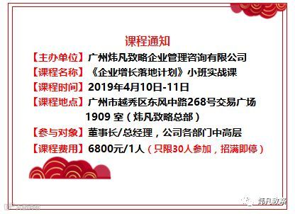 2019年4月10-11日,炜凡致略特邀您参加重磅打造的《2019 企业增长落地计划》小班实战课。