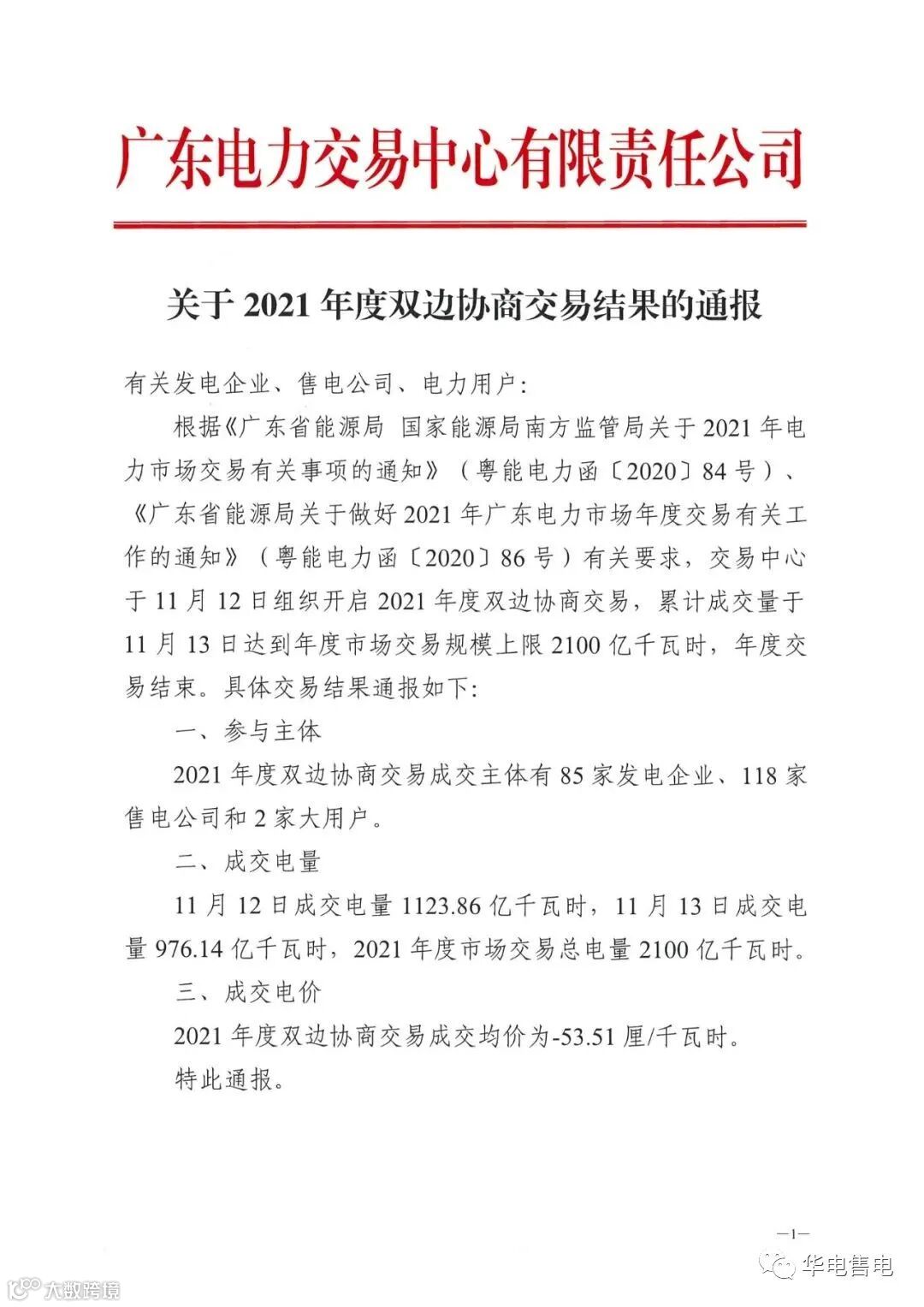11月14日,广东电力交易中心通报了2021年度双边协商交易结果。