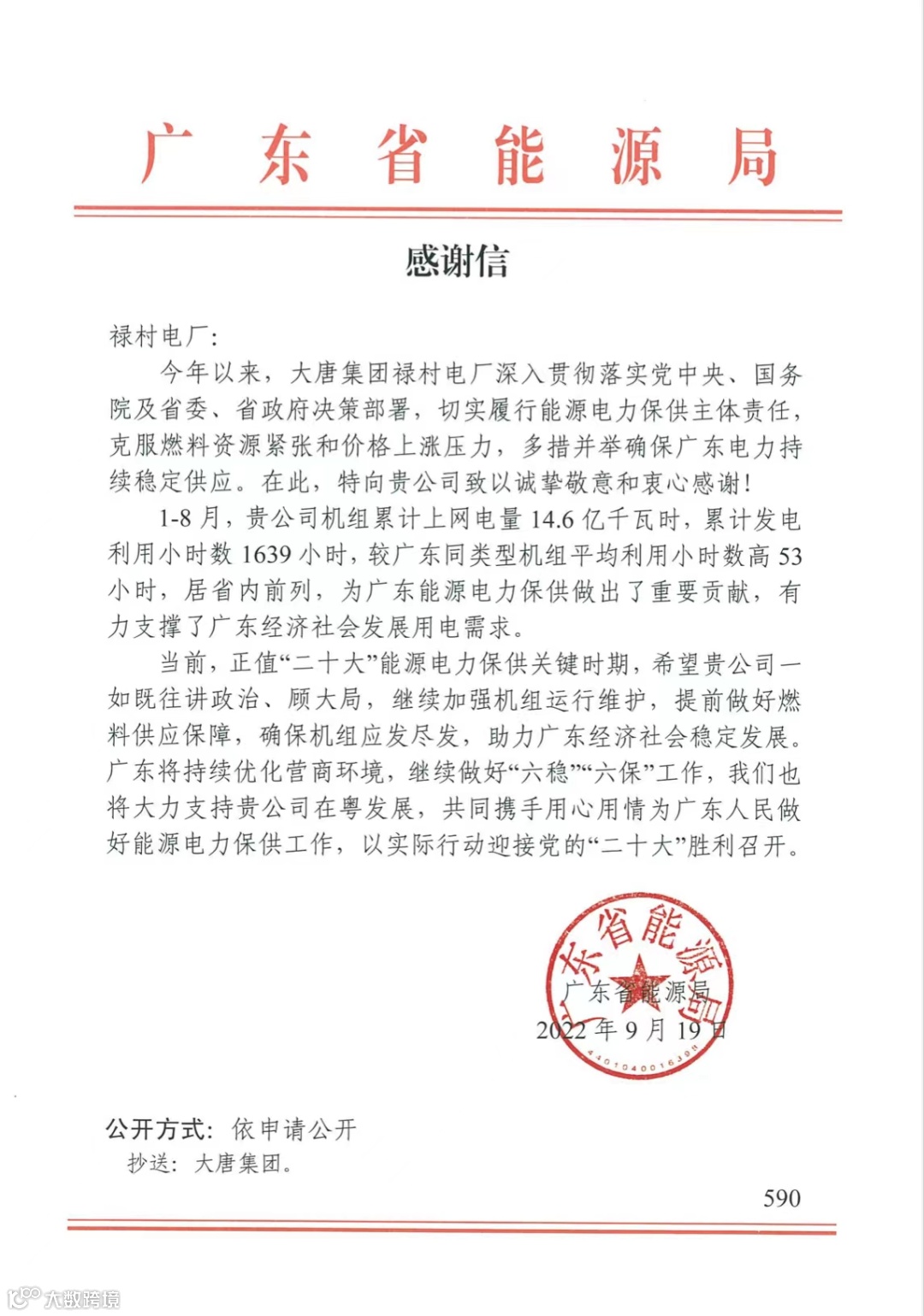 近日,大唐广东分公司所属的肇庆热电厂(禄村电厂)收到广东省能源局发来的《感谢信》,信中对该厂克服燃料资源紧张和价格上涨压力,多措并举为广东能源电力保供做出的重要贡献致以诚挚敬意和衷心感谢!