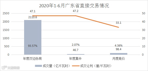 2020年1-6月,广东直接市场总成交量2255.7亿千瓦时,同比增长38.7%,规模增长逐步摆脱疫情影响;平均成交价差-46.5厘/千瓦时,从年度到月度价差让利逐步缩小;年度双边占市场总规模的93.57%,占市场主流。
