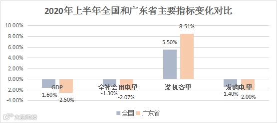 2020年上半年,广东省宏观经济和发用电量下滑幅度大于全国平均,但装机容量增长大幅高于全国。